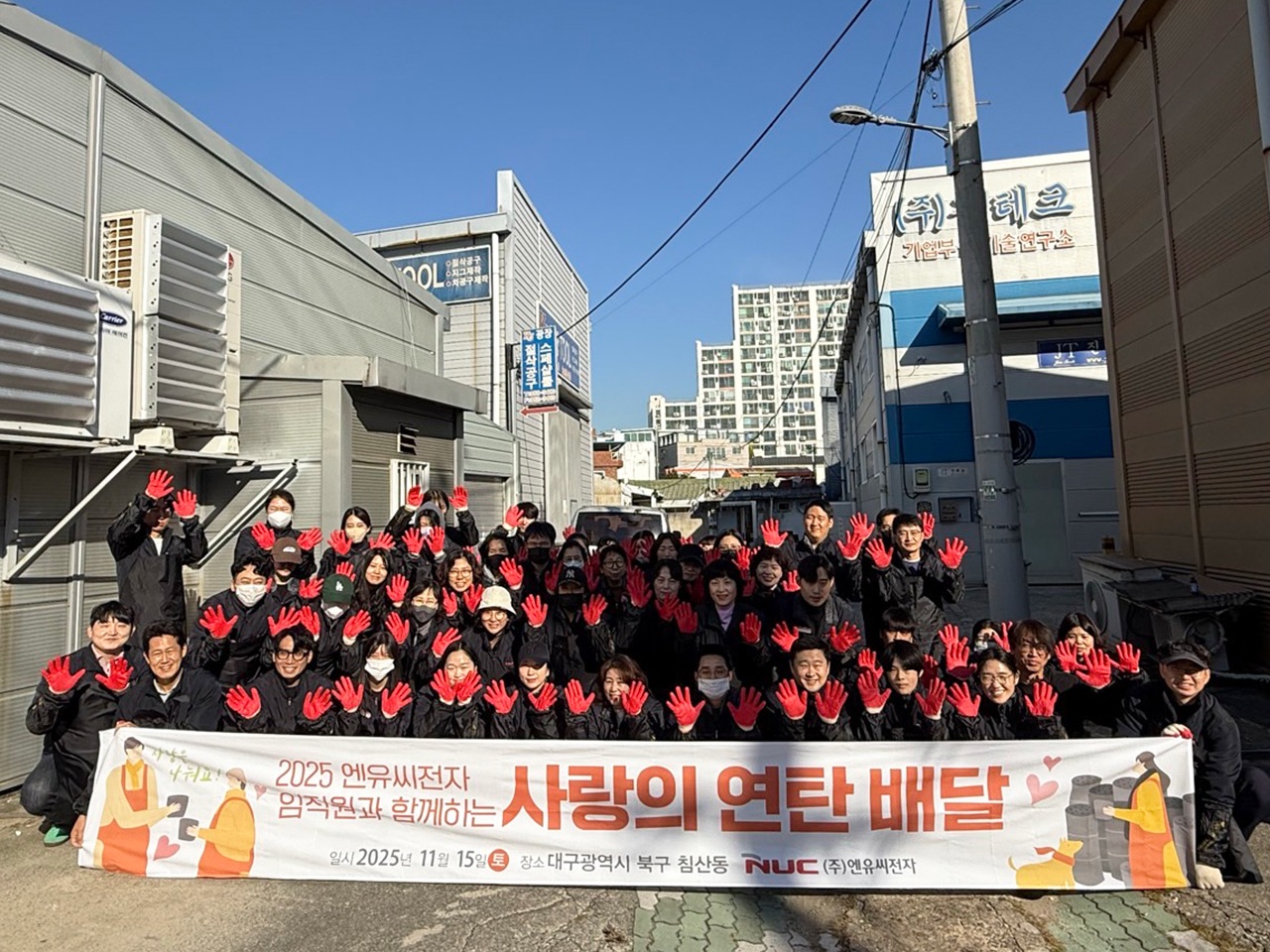 이번 봉사활동에는 임직원 50여 명이 직접 참여해 대구 북구 침산동 일대의 취약계층 가정을 방문하고 연탄을 전달하며 따뜻한 나눔을 실천했다. 이날 ㈜엔유씨전자는 총 3,333장의 연탄을 5가구에 직접 전달하며 어려운 이웃과 따뜻한 온기를 나눴다.